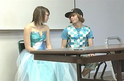Extra style points go to Elizabeth Ramouson (above left) who 'trusted her viscera' (as Tim Gunn would say) and made her prom dress out of gum wrappers. However, MY viscera and I are having a little giggle over the "boyfriend" (above right).